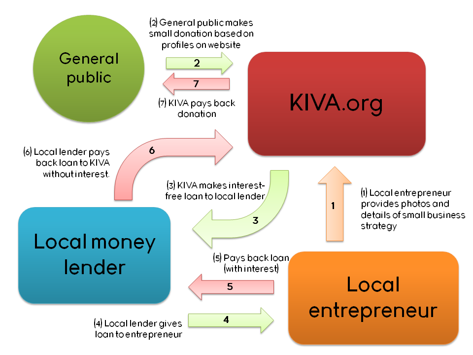 Crowd-funding still suffers from the unidirectional flow of money. Micro lending, however, creates the option to close the funding cycle. One of most popular micro lending platforms is Kiva.org and I will explain their structure as a template of a micro loan system (although this is not the only way to structure micro credit)