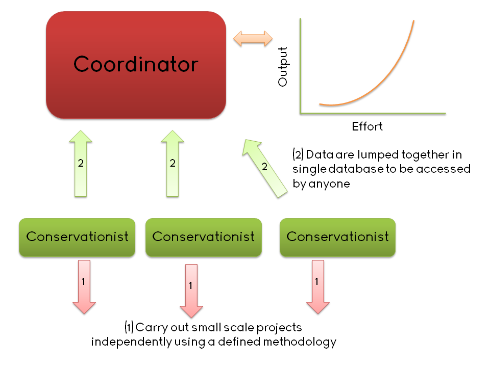 There are at least three ways that this model can work. First, decentralised data collectors can be used to compile massive datasets that would be beyond the capabilities of any singly institution. Bird Atlas projects are the perfect example of this. Second, a centralised institution can make its data available to the general public if it is unable to process and analyses these data by themselves. Species distribution data and Red List data from the IUCN have, for instance, been analysed by researchers from all over the world. Third, the use of collated data could be contingent on the contribution to the collection of those data. The Nutrient Network (NutNet) follows this structure; members from around the globe follow a fixed experimental protocol to gather data and, in return, they get access to everyone else’s data.