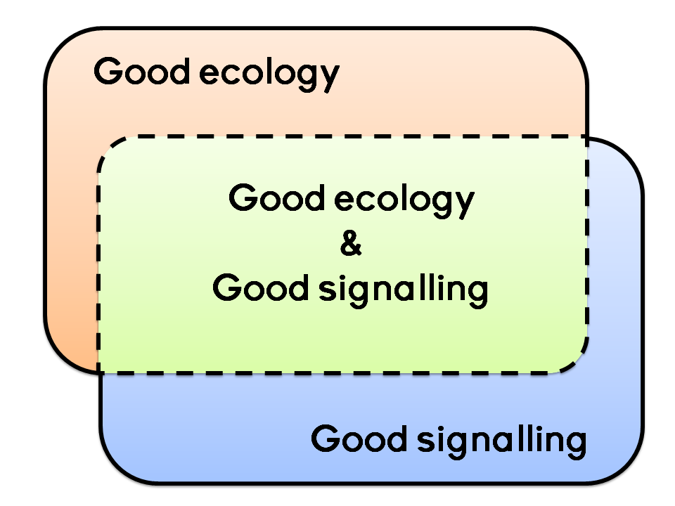 Let’s assume that everything considered “good ecology” (whatever that might be) falls within the orange zone. Similarly, “good signalling” is everything in the blue rectangle. There is obviously a large overlap between the two (green rectangle), because good ecology regularly speaks for itself and, sometimes, a bit a salesmanship is good for ecology (giving an engaging presentation at a conference, for example).