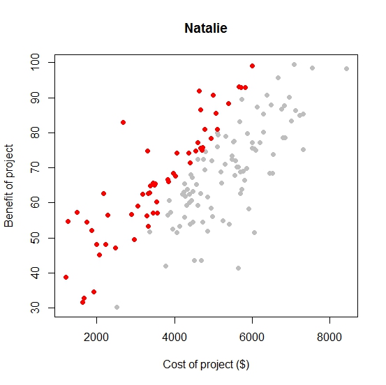 The last deputy-director is a cut-throat go-getter named Natalie. Natalie finished first at university with a double-major in business management and applied mathematics and she has never, ever suffered the indignity of settling for anything other than the best. She wants the best job, best lifestyle, best home, best children best… you get the picture. Needless to say, Natalie’s inability to tolerate fools meant that she ruffled many feathers on her way to the deputy-director; but her results speak for themselves. Like everything else, Natalie had to optimise her conservation portfolio. She determined the relative benefit of each program and built up here portfolio by selecting the most effective programs per dollar until her budget was exceeded. (Natalie’s selections are marked in RED)
