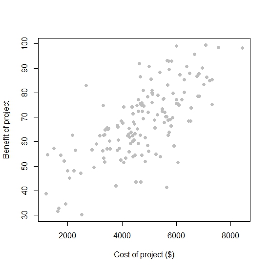 Let’s imagine a scenario where there are 150 possible conservation programs that can be implemented by a conservation agency. Each has a fixed cost randomly selected from a normal distribution (mean = $ 5 000; standard deviation = $ 1 500) and a fixed conservation benefit, also from a normal distribution (mean = 70; standard deviation = 15). The benefits are arbitrary units but, if it makes things easier to understand, imagine that it is the number of species protected by the program. The scenario is also set up so that there is a 0.75 correlation between the cost of a program and its benefits: generally, the most expensive programs reap the greatest conservation rewards (although this relationship is not perfect).