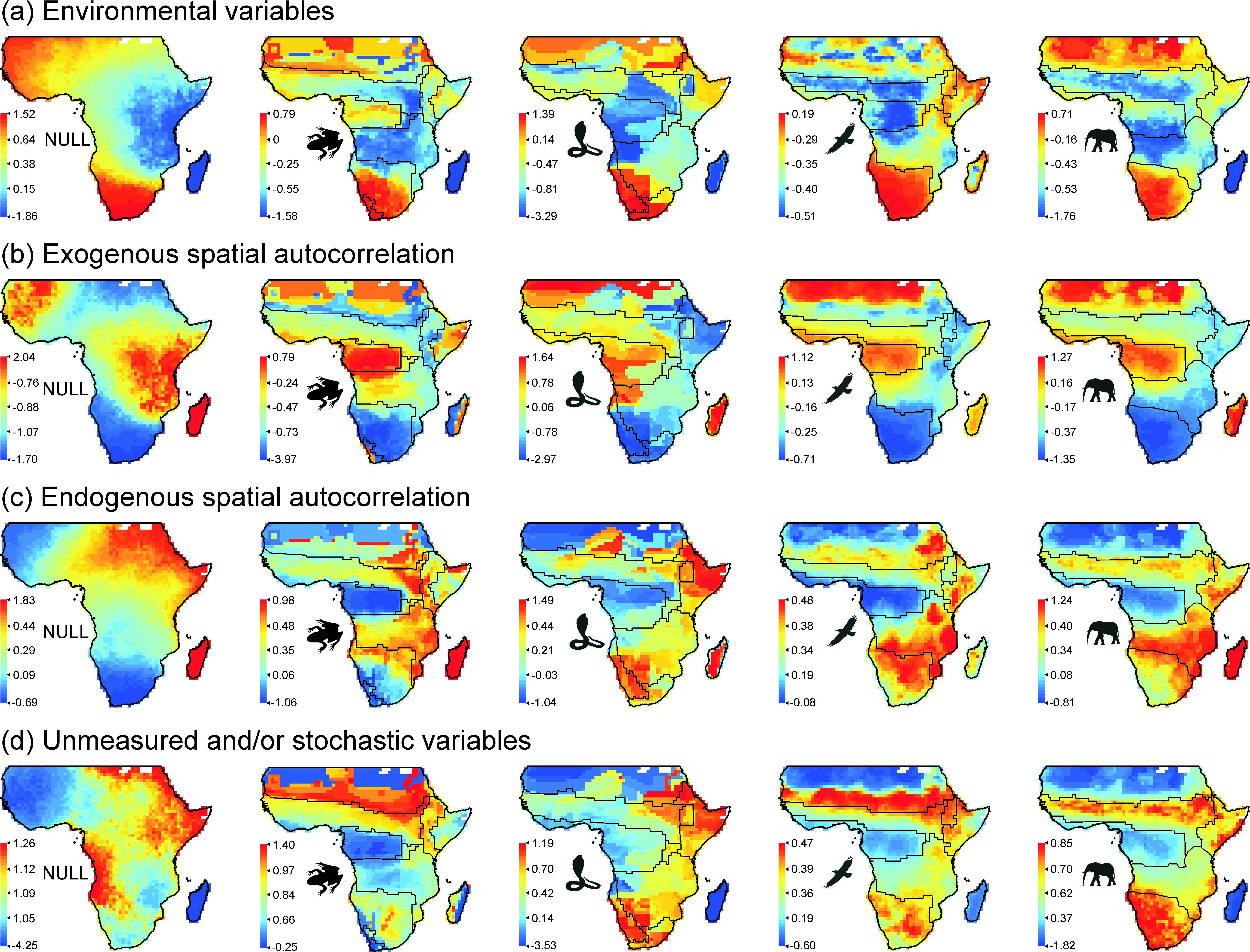 In our latest study just published online at Ecography, we set out to quantify the degree of environmental correlation, exogenous and endogenous spatial autocorrelation in the distributions of 4 423 species of amphibians, reptiles, birds and mammals in Africa.