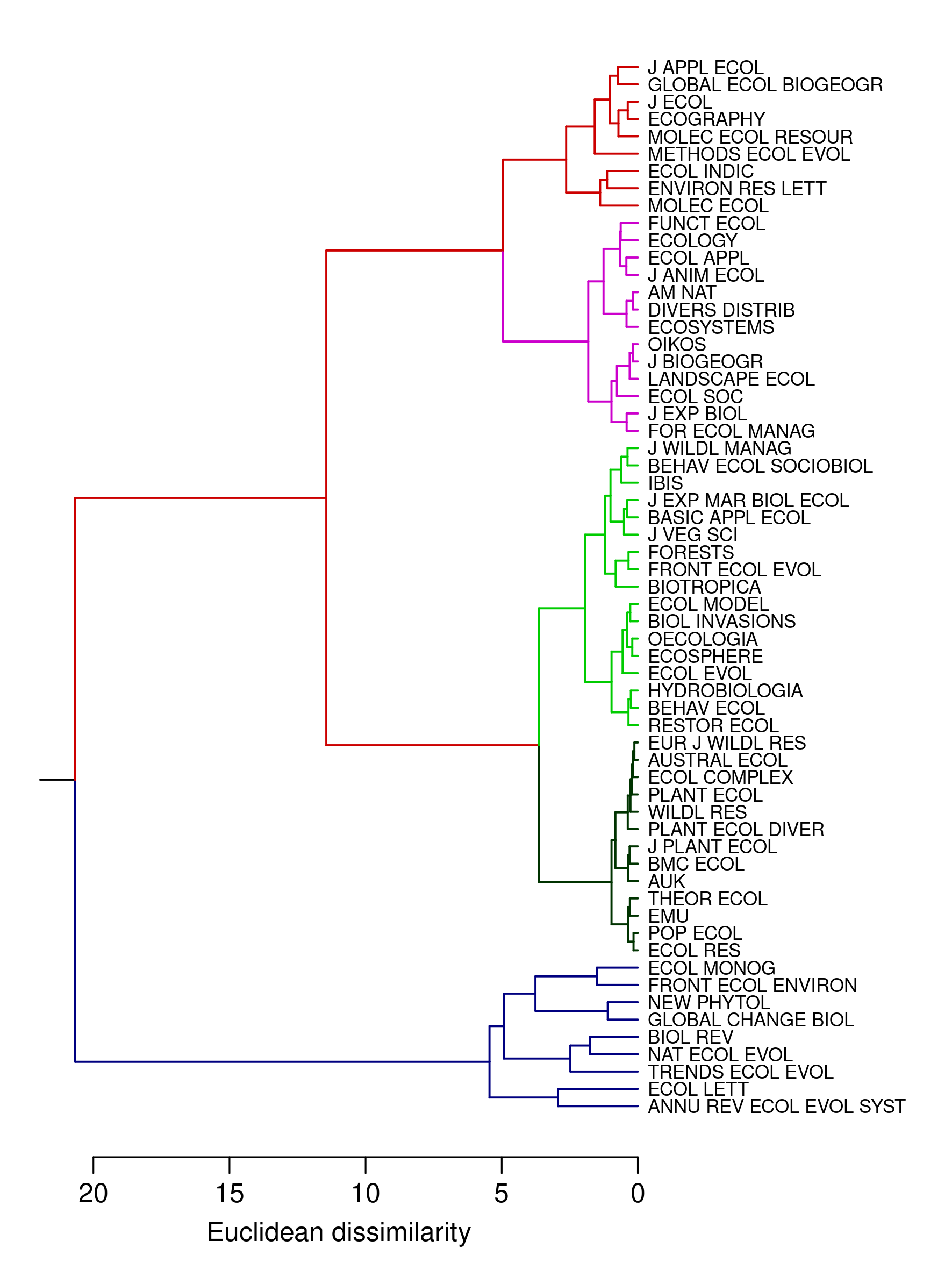 This begs the question: how should we distinguish between branches on the journal tree? Its pretty simple really. In fact, Corey Bradshaw showed us how in his original paper (Figure 3). It is possible to cluster journals based on their impact metrics, so that their relationships are a hierarchical tree instead of a ranking (code available at the end of this post). Here is an example for Ecology journal using the same impact metrics used for multidimensional rankings: